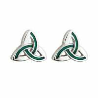 Rhodium Plated Trinity Knot Stud Earrings With Green Enamel Panels