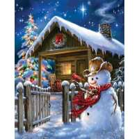 Sneeuwpop bij kersthuisje 40x50cm (Bestseller) / Rond