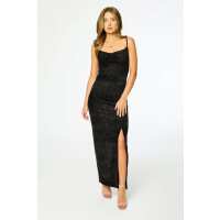 Glitter Velvet Drape-Neck Spaghetti-Strap Maxi Dress with Side Slit Black / L