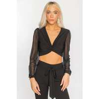 Twisted Front Crop Top with Chiffon Balloon Sleeves XS / Black