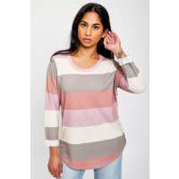 Mauve Striped 3/4 Sleeve Scoop-Neck Shirt with Shirttail Hem Mauve/Oatmeal/Taupe / L