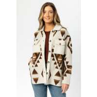 Abstract Oversized Shacket with Sherpa Trims Ivory/Brown / L