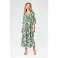 Floral Smocked Balloon-Sleeve Square-Neck Midi Dress with Pockets Green / L
