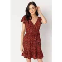 Ditsy Knit Flutter Sleeve Crossover Dress L / Black/Red