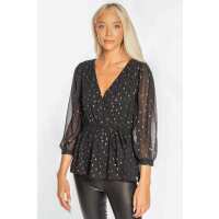 Foil Chiffon Crossover Blouse with Tie-Belt L / Black/Black