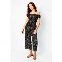 Ditsy Smocked Off-The-Shoulder Jumpsuit with Tie-Belt Black/Rust / L