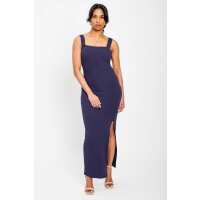 Ribbed Square-Neck Maxi Dress with Side Slit Navy / XL