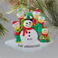 Personalized Green Hat Family Building Snowman Ornament