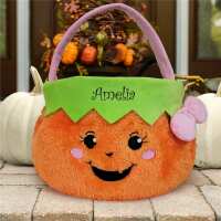 Embroidered Girl Fuzzy Pumpkin Trick or Treat Basket