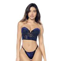 Floral Burnout Velvet Cropped Bustier & G-String Set Black/Blue / S/M