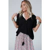 Leila Ribbed Henley Top - Black