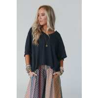 Cozy Oversized Slub V Neck Top - Black