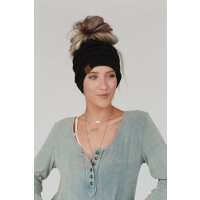 Messy Bun Knitted Beanie Hat - Black