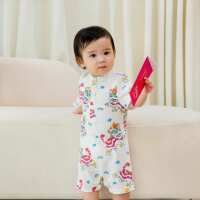 Lion Dance Series - Baby Boy Shirt Romper in White Lion Print (Personalisable)-9-12M