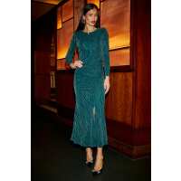 Yumi Green Mesh Fitted Ruched Midi Dress With Long Sleeves Green / 14