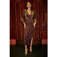 Yumi Navy Velour Stretch Midi Dress With Long Sleeves Gold / 14