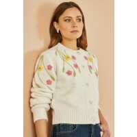 Yumi Beige Flower Embroidered Chunky Knit Cardigan Ivory / S